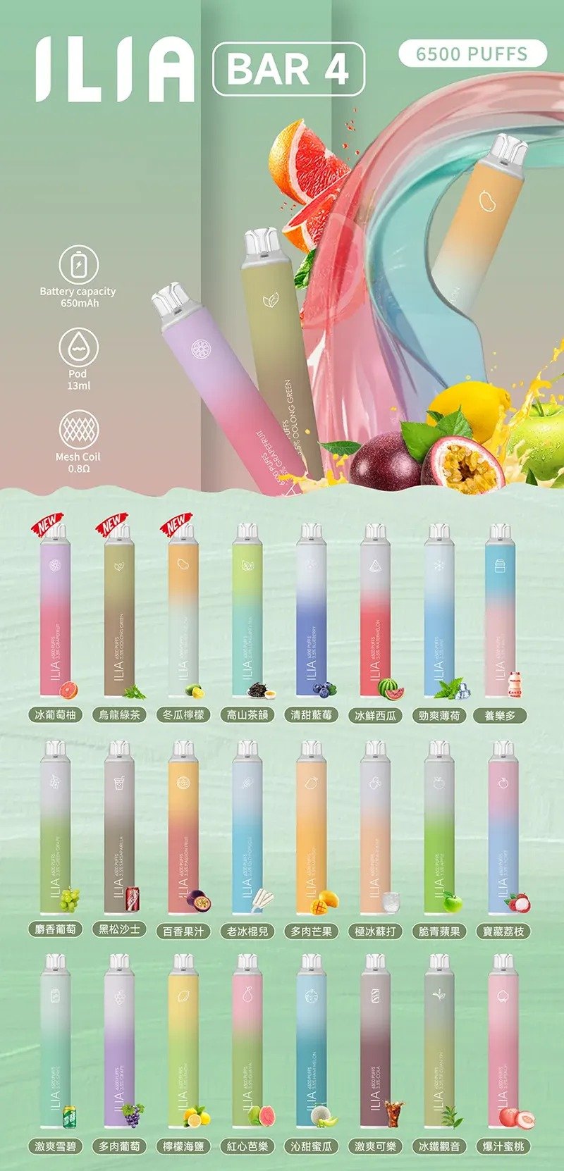 ILIA Bar 4 是哩亞一次性電子煙下高品質產品,設計簡約時尚,體積小巧,方便攜帶。ILIA BAR 4 拋棄式電子煙內置650mAh大容量電池,支持長達6500口的使用壽命,讓您能夠長時間享受穩定的煙霧輸出。這款電子煙裝填了13Pod的煙油,搭配0.8Ω電阻,確保每次吸入都能獲得豐富的口感和順滑的體驗。